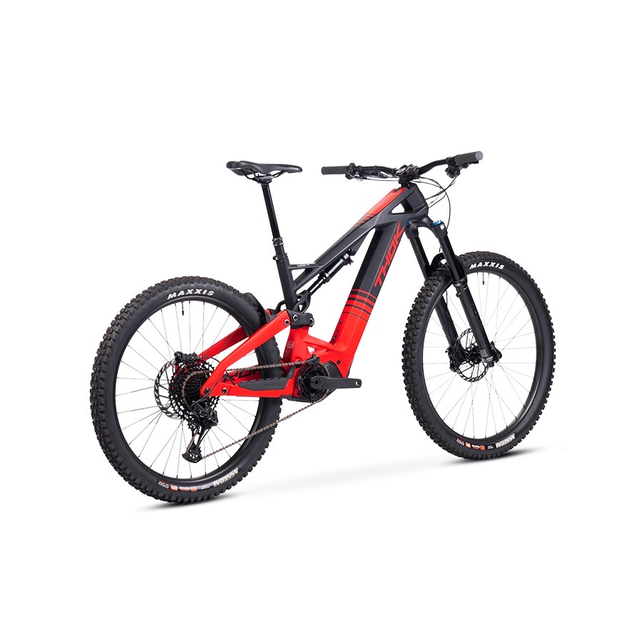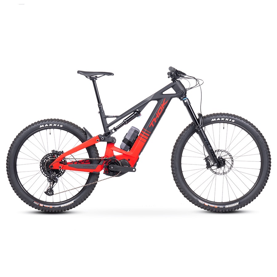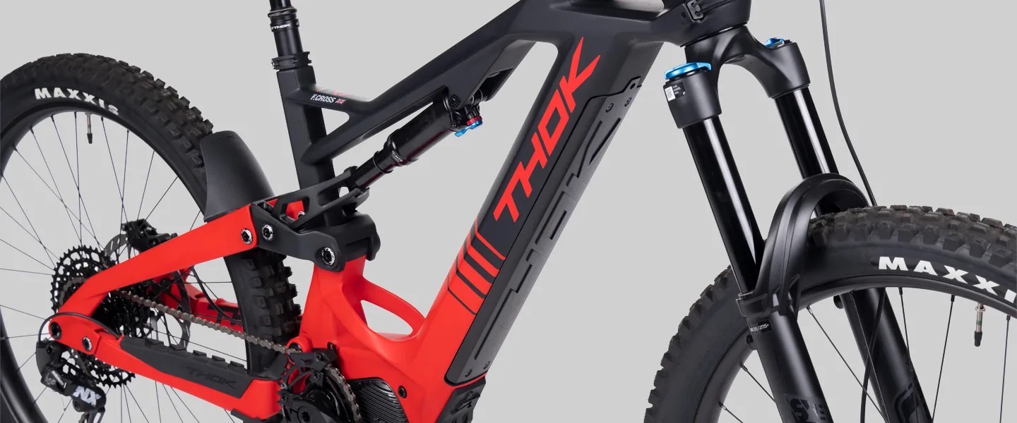 | Frame | THOK unidirectional full carbon, tapered headtube 1.8, 29″/27.5″ geometry, integrated downtube battery, UDH hanger tech, enclosed internal cable, sealed cartridge bearings, 170 mm travel | – |